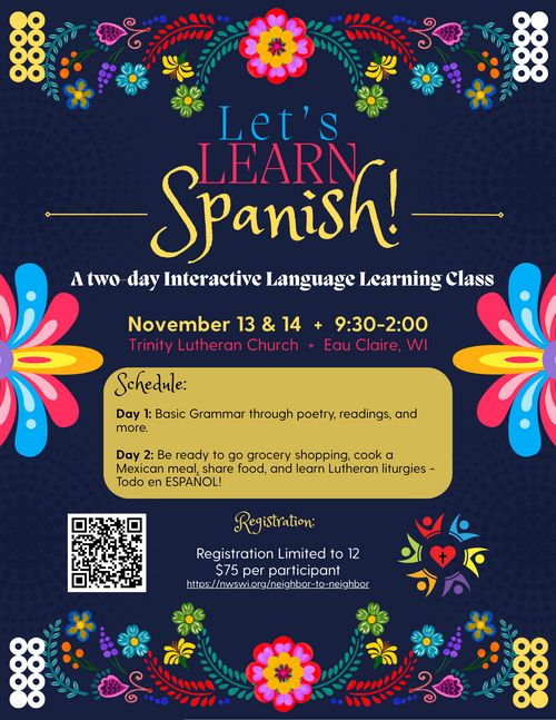 Day 2 will include grocery shopping, making/sharing a Mexican meal, and learning Lutheran liturgies... todo en Español! Class is limited to 12 participants, so be sure to secure you spot by registering ASAP.