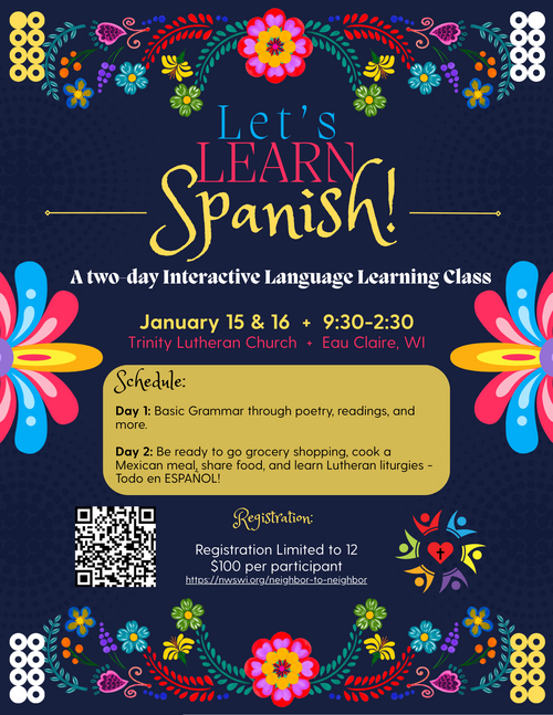 Day 2 will include grocery shopping, making/sharing a Mexican meal, and learning Lutheran liturgies... todo en Español! Class is limited to 12 participants, so be sure to secure you spot by registering ASAP.